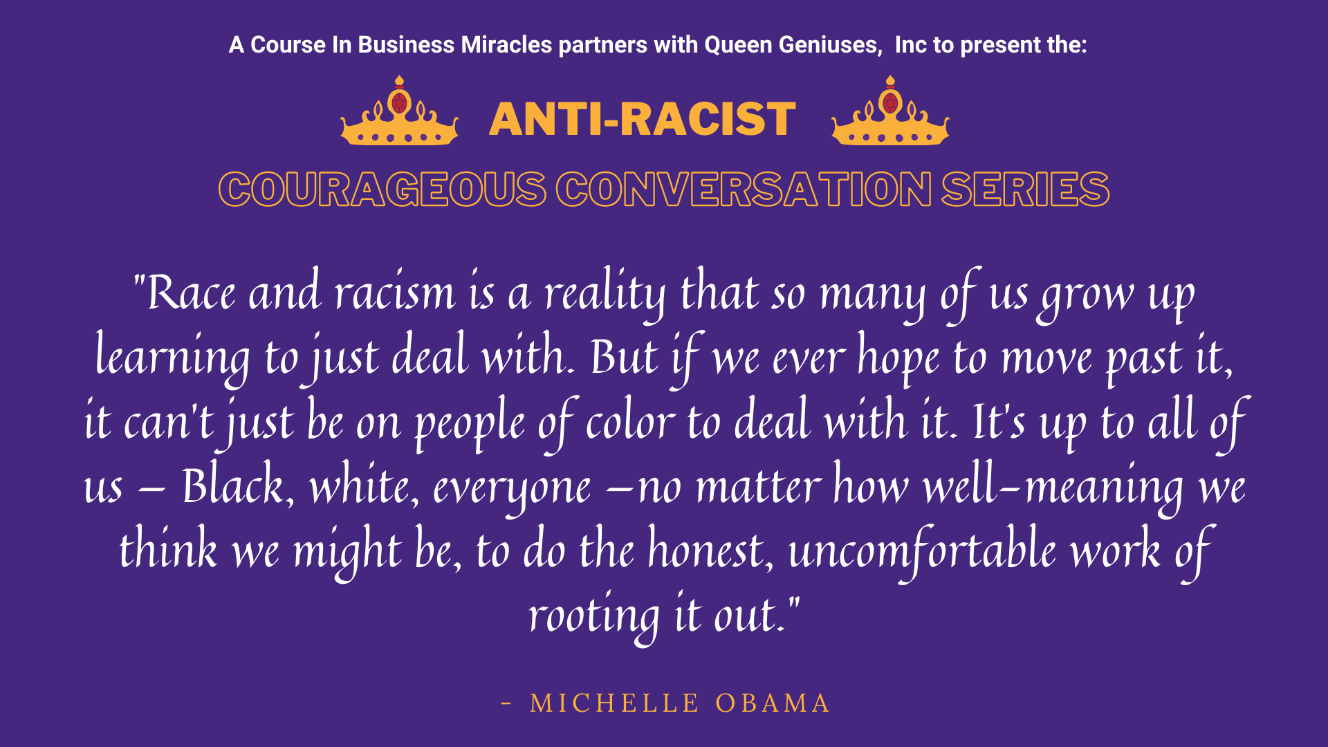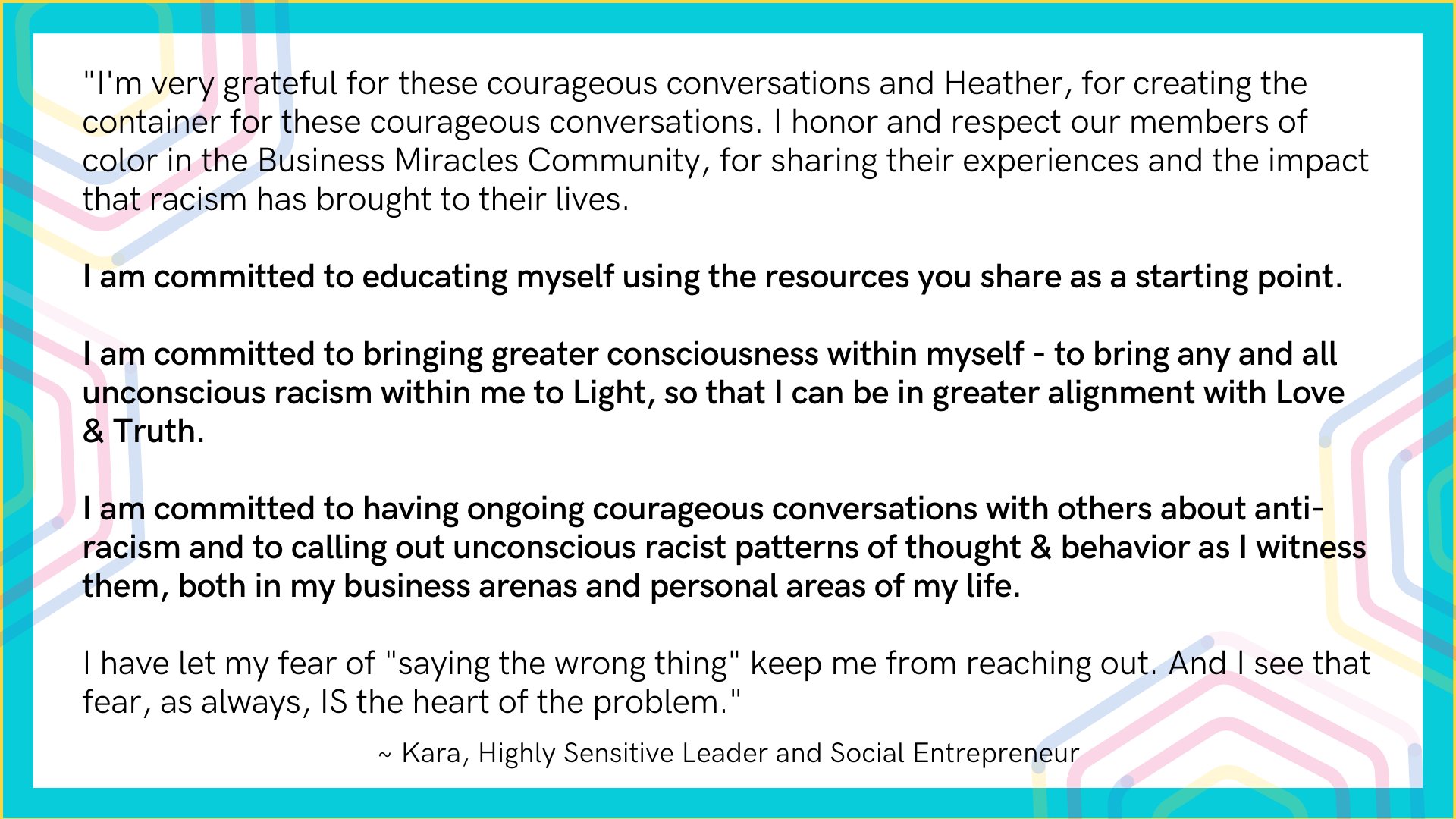 Together, long term Business Miracles member (and my former high school student), Regine Roy, CEO of Queen Geniuses, Inc., and I created The Anti-Racist Courageous Conversation Series to educate and train the members of the Business Miracles Community, all Highly Sensitive Entrepreneurs and Leaders, on how to effectively engage in this movement longterm - in a way that works for us as highly sensitives.