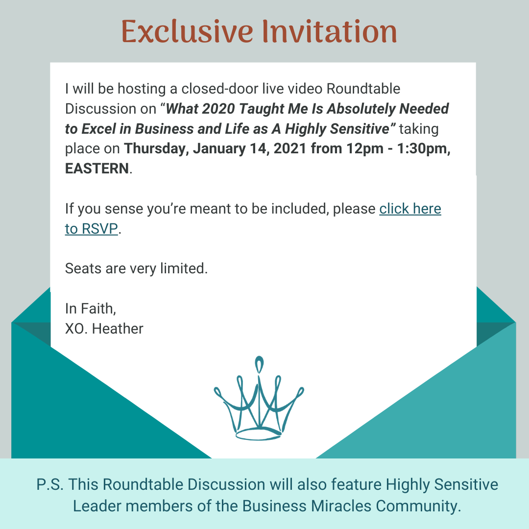 I will be hosting a closed-door live video Roundtable Discussion on "What 2020 Taught Me Is Absolutely Needed to Excel in Business and Life as A Highly Sensitive" taking place on Thursday, January 14, 2021 from 12pm - 1:30pm, EASTERN.